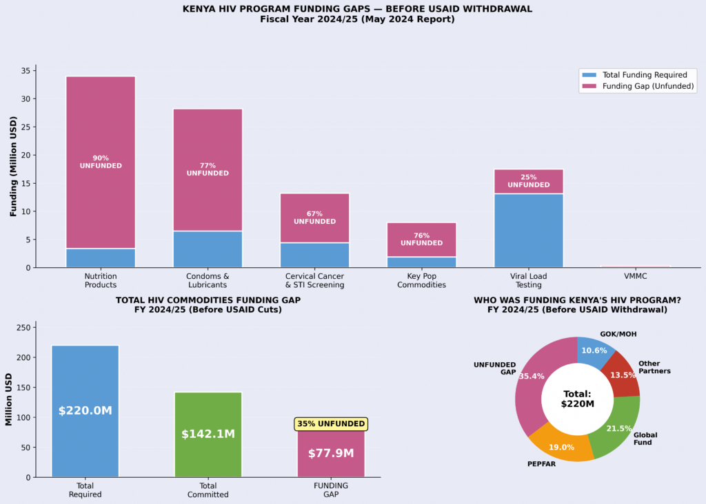 A National Quantification Report for HIV Commodities for FY 2024/25 to 2026/27 by National AIDS and STI Control Program (NASCOP) in March 2024 revealed a funding gap of USD77.9 million for HIV commodities, which represent 35 per cent of the total need unfunded.
